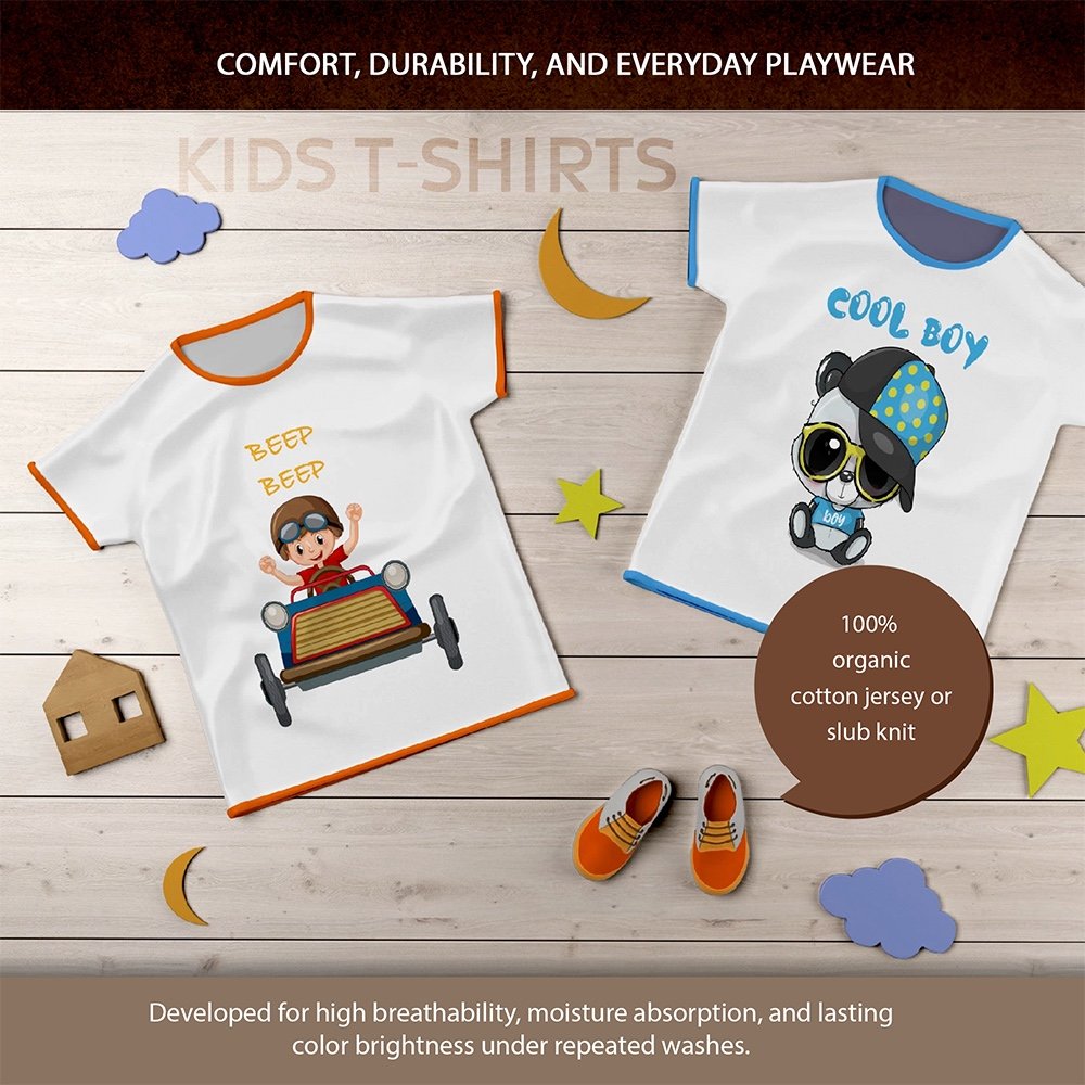 Eco-friendly organic cotton T-shirts designed for comfort, durability, and everyday playwear.
