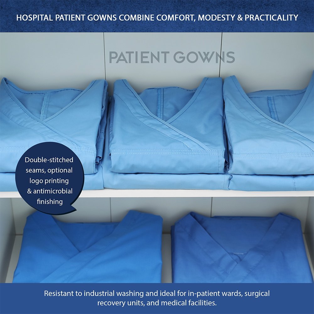 Our hospital patient gowns combine comfort, modesty, and practicality for frequent use in healthcare environments.