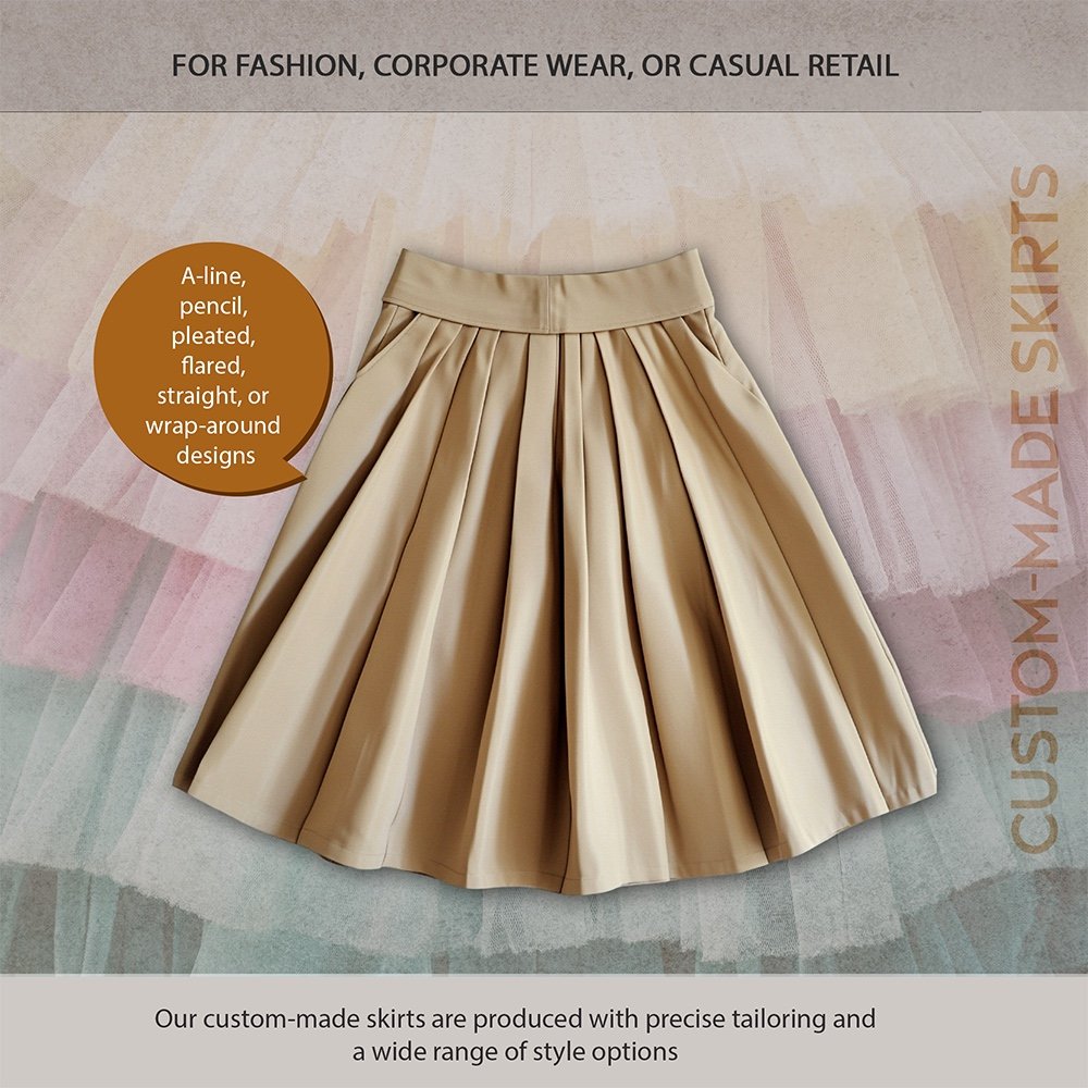 Our custom-made skirts are produced with precise tailoring and a wide range of style options suitable for fashion, corporate wear, or casual retail.