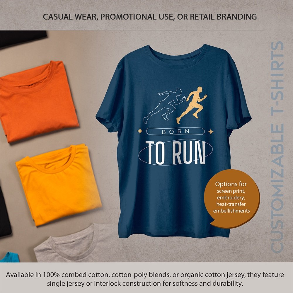 • Designs: Crew neck, V-neck, or round neck with short or long sleeves; options for screen print, embroidery, and heat-transfer embellishments.